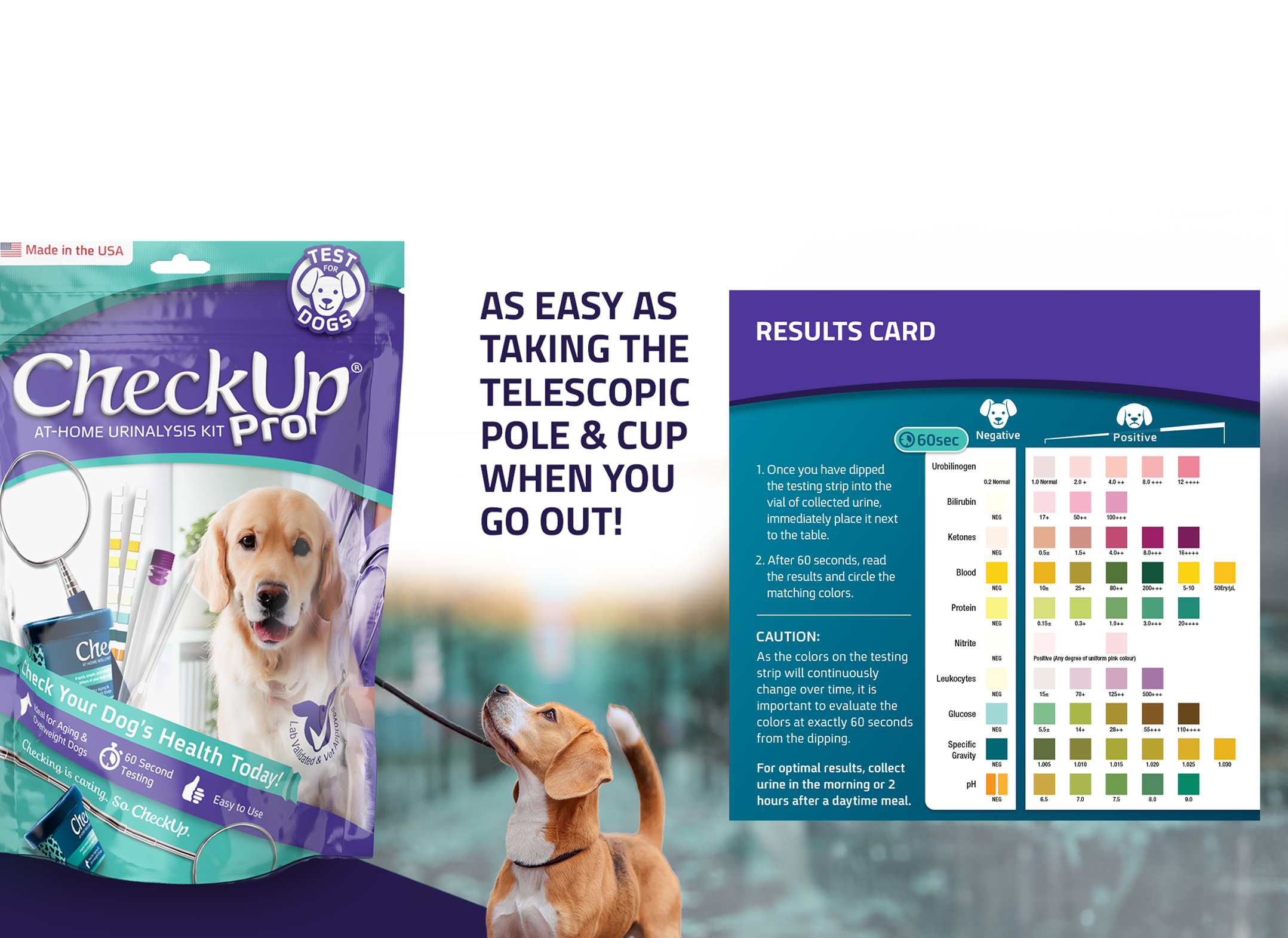 CheckUp Pro makes it easy to monitor your dog’s health from home with vet-trusted accuracy. This all-in-one kit includes 2 urine test strips that detect 10 vital health markers such as glucose, protein, blood, pH, and more. Plus a telescopic collection pole and reusable cup for clean, hands-free sample collection. Non-invasive and simple to use, results appear in just 30–120 seconds with a color-coded chart for fast interpretation. Ideal for routine wellness checks or early detection of potential issues, CheckUp Pro helps you stay proactive about your dog’s health, no vet visit required.
